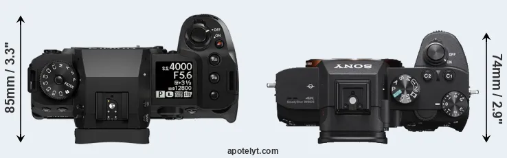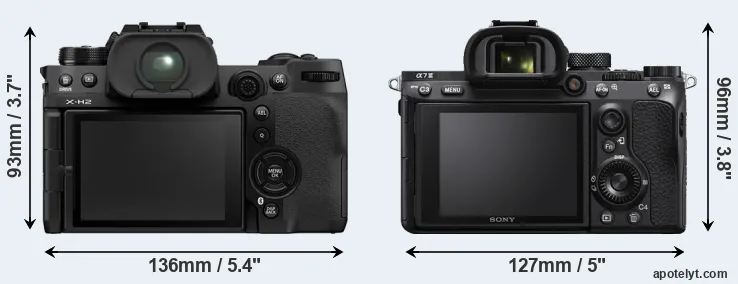 The physical size and weight of the Fujifilm X-H2 and the Sony A7 III are illustrated in the side-by-side display below. The two cameras are presented according to their relative size. Three consecutive perspectives from the front, the top, and the back are available. All width, height and depth measures are rounded to the nearest millimeter.