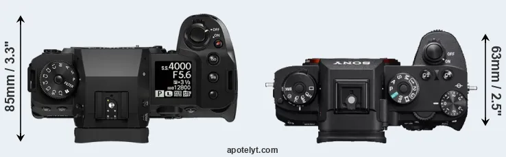 The physical size and weight of the Fujifilm X-H2 and the Sony A9 are illustrated in the side-by-side display below. The two cameras are presented according to their relative size. Three consecutive perspectives from the front, the top, and the back are available. All width, height and depth measures are rounded to the nearest millimeter.