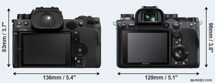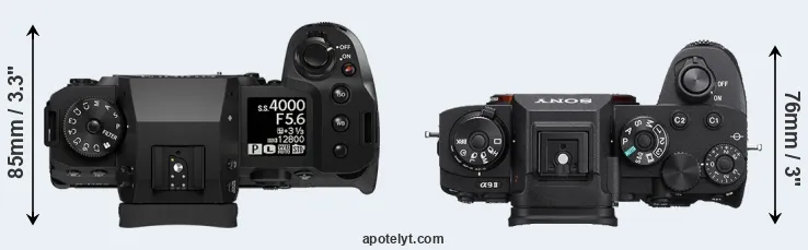 The physical size and weight of the Fujifilm X-H2 and the Sony A9 II are illustrated in the side-by-side display below. The two cameras are presented according to their relative size. Three consecutive perspectives from the front, the top, and the back are available. All width, height and depth measures are rounded to the nearest millimeter.
