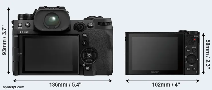 If the front view area (width x height) of the cameras is taken as an aggregate measure of their size, the Sony HX90V is considerably smaller (53 percent) than the Fujifilm X-H2. It is worth mentioning in this context that the X-H2 is splash and dust resistant, while the HX90V does not feature any corresponding weather-sealing.