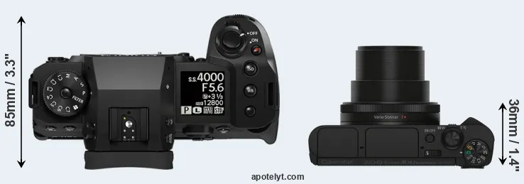 The side-by-side display below illustrates the physical size and weight of the Fujifilm X-H2 and the Sony HX90V. The two cameras are presented according to their relative size. Three consecutive views from the front, the top, and the rear side are shown. All width, height and depth measures are rounded to the nearest millimeter.