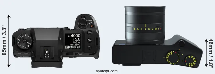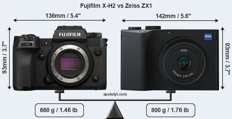 If the front view area (width x height) of the cameras is taken as an aggregate measure of their size, the Zeiss ZX1 is somewhat larger (4 percent) than the Fujifilm X-H2. It is worth mentioning in this context that the X-H2 is splash and dust resistant, while the ZX1 does not feature any corresponding weather-sealing.