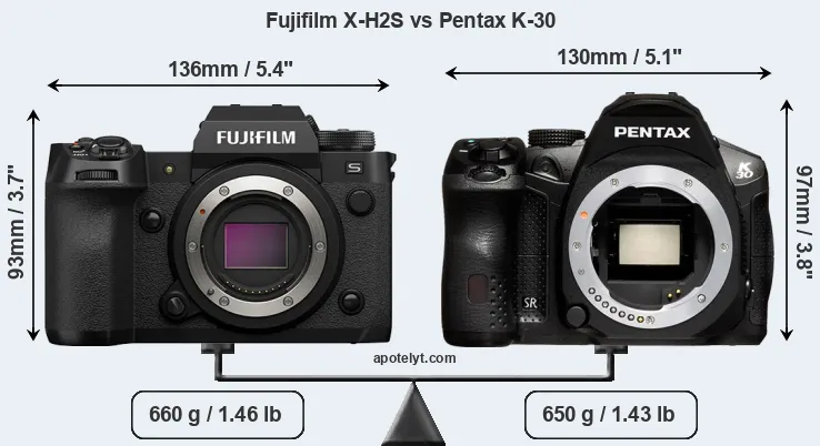 The physical size and weight of the Fujifilm X-H2S and the Pentax K-30 are illustrated in the side-by-side display below. The two cameras are presented according to their relative size. Three consecutive views from the front, the top, and the rear side are shown. All width, height and depth measures are rounded to the nearest millimeter.