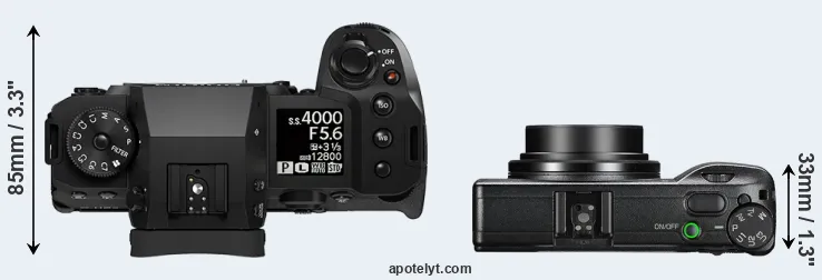 An illustration of the physical size and weight of the Fujifilm X-H2S and the Ricoh GR III is provided in the side-by-side display below. The two cameras are presented according to their relative size. Three consecutive perspectives from the front, the top, and the back are available. All width, height and depth dimensions are rounded to the nearest millimeter.