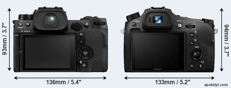 If the front view area (width x height) of the cameras is taken as an aggregate measure of their size, the Sony RX10 IV is somewhat smaller (1 percent) than the Fujifilm X-H2S. In this context, it is worth noting that both cameras are splash and dust-proof and can, hence, be used in inclement weather conditions or harsh environments.