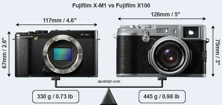 If the front view area (width x height) of the cameras is taken as an aggregate measure of their size, the Fujifilm X100 is notably larger (21 percent) than the Fujifilm X-M1. In this context, it is worth noting that neither the X-M1 nor the X100 are weather-sealed.