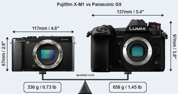 If the front view area (width x height) of the cameras is taken as an aggregate measure of their size, the Panasonic G9 is considerably larger (70 percent) than the Fujifilm X-M1. Moreover, the G9 is substantially heavier (99 percent) than the X-M1. It is noteworthy in this context that the G9 is splash and dust-proof, while the X-M1 does not feature any corresponding weather-sealing.