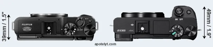 The physical size and weight of the Fujifilm X-M1 and the Sony A6300 are illustrated in the side-by-side display below. The two cameras are presented according to their relative size. Three successive views from the front, the top, and the rear are shown. All width, height and depth measures are rounded to the nearest millimeter.