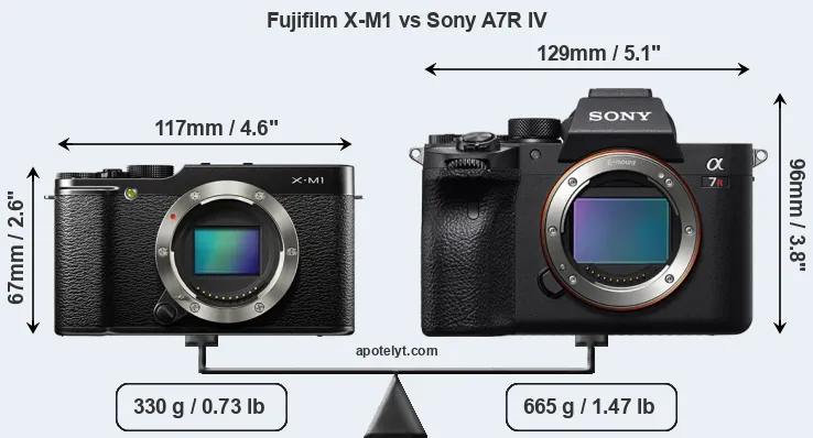 If the front view area (width x height) of the cameras is taken as an aggregate measure of their size, the Sony A7R IV is considerably larger (58 percent) than the Fujifilm X-M1. Moreover, the A7R IV is substantially heavier (102 percent) than the X-M1. It is noteworthy in this context that the A7R IV is splash and dust-proof, while the X-M1 does not feature any corresponding weather-sealing.