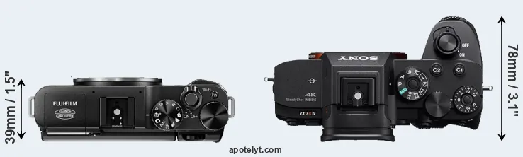 An illustration of the physical size and weight of the Fujifilm X-M1 and the Sony A7R IV is provided in the side-by-side display below. The two cameras are presented according to their relative size. Three consecutive views from the front, the top, and the rear side are shown. All width, height and depth measures are rounded to the nearest millimeter.