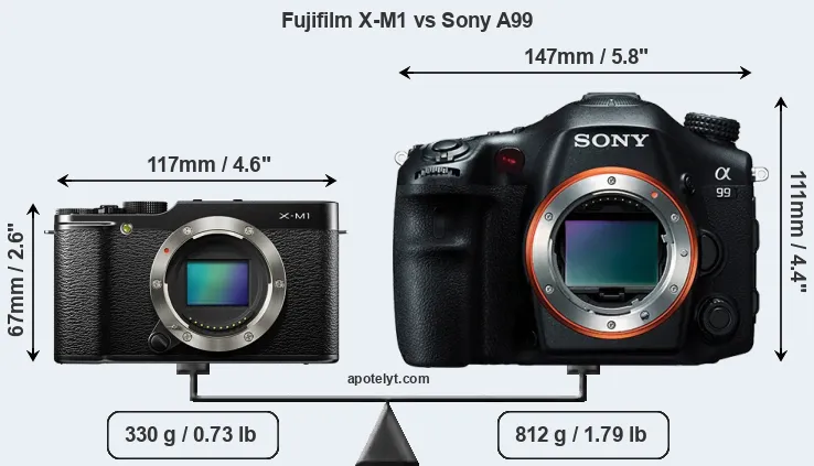 If the front view area (width x height) of the cameras is taken as an aggregate measure of their size, the Sony A99 is considerably larger (108 percent) than the Fujifilm X-M1. Moreover, the A99 is substantially heavier (146 percent) than the X-M1. It is noteworthy in this context that the A99 is splash and dust-proof, while the X-M1 does not feature any corresponding weather-sealing.