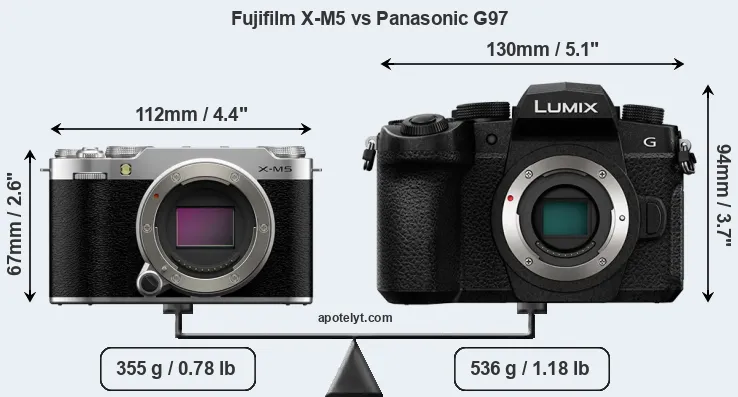 An illustration of the physical size and weight of the Fujifilm X-M5 and the Panasonic G97 is provided in the side-by-side display below. The two cameras are presented according to their relative size. Three consecutive perspectives from the front, the top, and the back are available. All width, height and depth dimensions are rounded to the nearest millimeter.