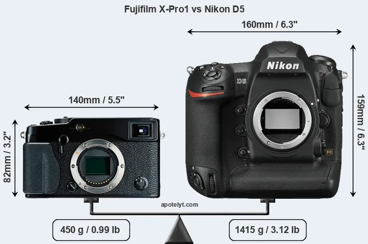 If the front view area (width x height) of the cameras is taken as an aggregate measure of their size, the Nikon D5 is considerably larger (122 percent) than the Fujifilm X-Pro1. Moreover, the D5 is substantially heavier (214 percent) than the X-Pro1. It is noteworthy in this context that the D5 is splash and dust-proof, while the X-Pro1 does not feature any corresponding weather-sealing.