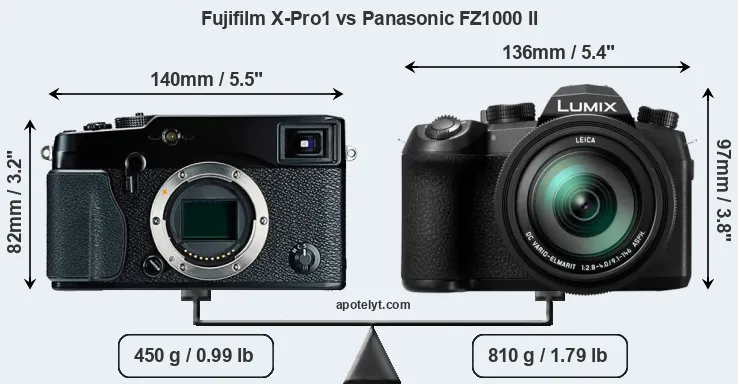 The physical size and weight of the Fujifilm X-Pro1 and the Panasonic FZ1000 II are illustrated in the side-by-side display below. The two cameras are presented according to their relative size. Three consecutive perspectives from the front, the top, and the back are available. All width, height and depth measures are rounded to the nearest millimeter.