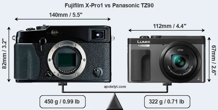 If the front view area (width x height) of the cameras is taken as an aggregate measure of their size, the Panasonic TZ90 is considerably smaller (35 percent) than the Fujifilm X-Pro1. In this context, it is worth noting that neither the X-Pro1 nor the TZ90 are weather-sealed.