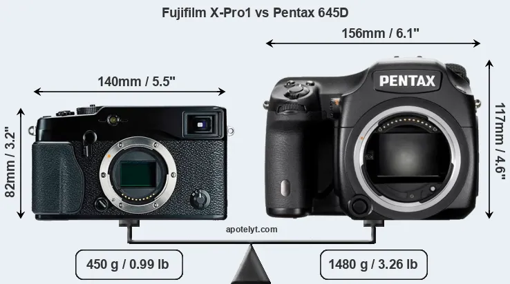 The side-by-side display below illustrates the physical size and weight of the Fujifilm X-Pro1 and the Pentax 645D. The two cameras are presented according to their relative size. Three consecutive perspectives from the front, the top, and the back are available. All width, height and depth measures are rounded to the nearest millimeter.