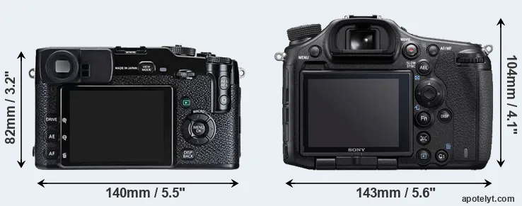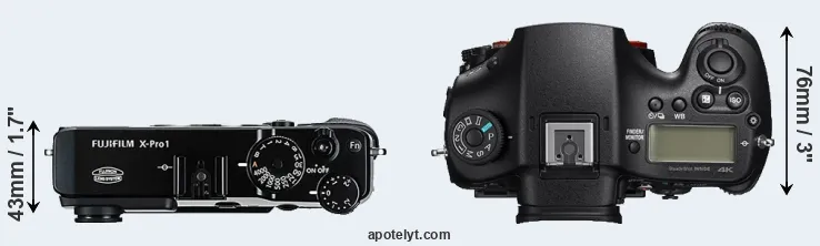 The side-by-side display below illustrates the physical size and weight of the Fujifilm X-Pro1 and the Sony A99 II. The two cameras are presented according to their relative size. Three consecutive views from the front, the top, and the rear side are shown. All width, height and depth dimensions are rounded to the nearest millimeter.