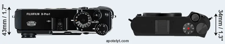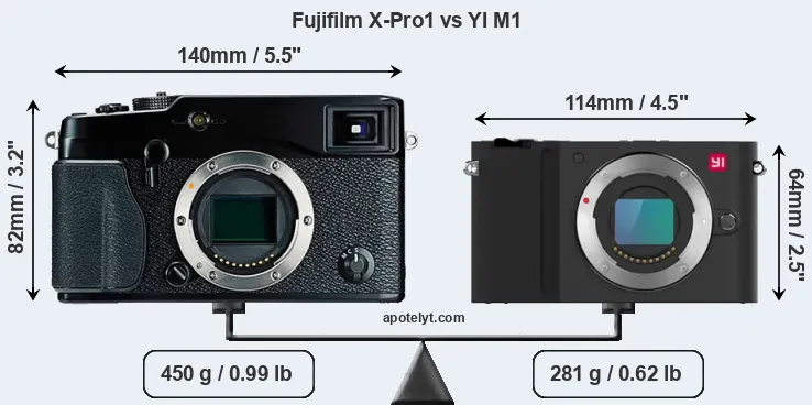 The side-by-side display below illustrates the physical size and weight of the Fujifilm X-Pro1 and the YI M1. The two cameras are presented according to their relative size. Three successive views from the front, the top, and the rear are shown. All width, height and depth dimensions are rounded to the nearest millimeter.