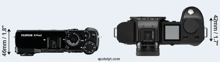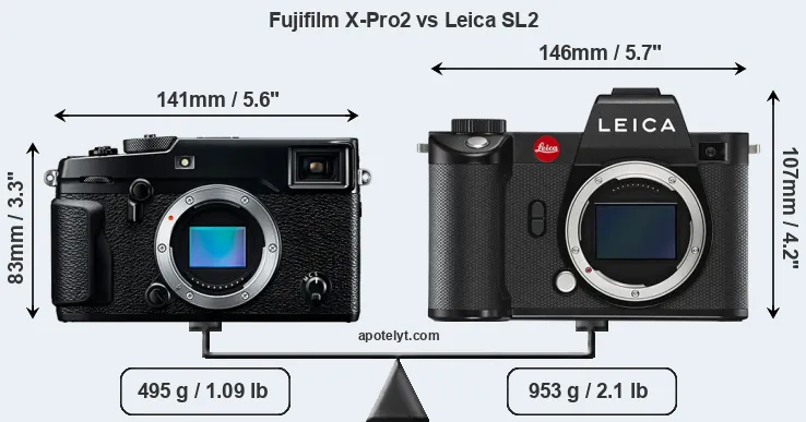 An illustration of the physical size and weight of the Fujifilm X-Pro2 and the Leica SL2 is provided in the side-by-side display below. The two cameras are presented according to their relative size. Three successive views from the front, the top, and the rear are shown. All width, height and depth measures are rounded to the nearest millimeter.