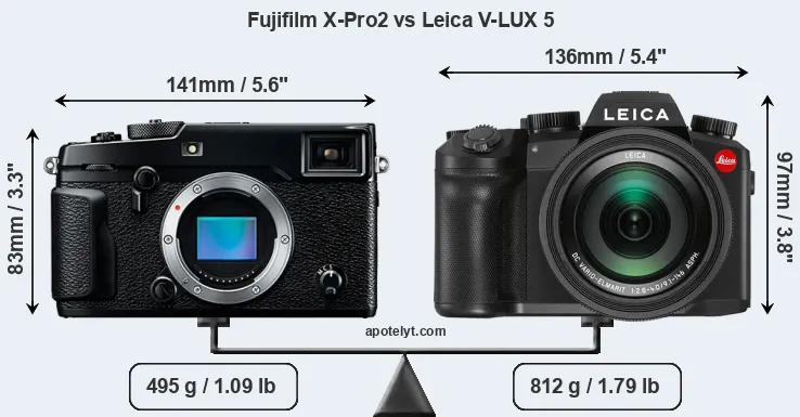 If the front view area (width x height) of the cameras is taken as an aggregate measure of their size, the Leica V-LUX 5 is notably larger (13 percent) than the Fujifilm X-Pro2. It is worth mentioning in this context that the X-Pro2 is splash and dust resistant, while the V-LUX 5 does not feature any corresponding weather-sealing.