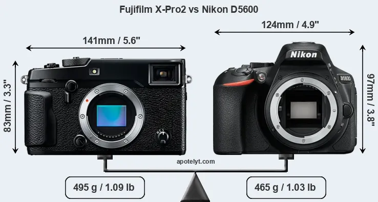 If the front view area (width x height) of the cameras is taken as an aggregate measure of their size, the Nikon D5600 is somewhat larger (3 percent) than the Fujifilm X-Pro2. However, the D5600 is markedly lighter (6 percent) than the X-Pro2. It is worth mentioning in this context that the X-Pro2 is splash and dust resistant, while the D5600 does not feature any corresponding weather-sealing.