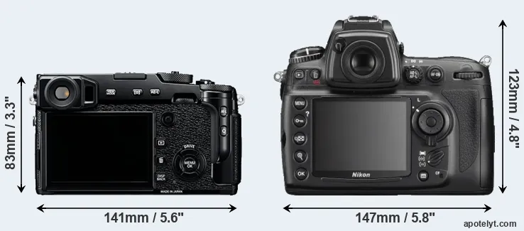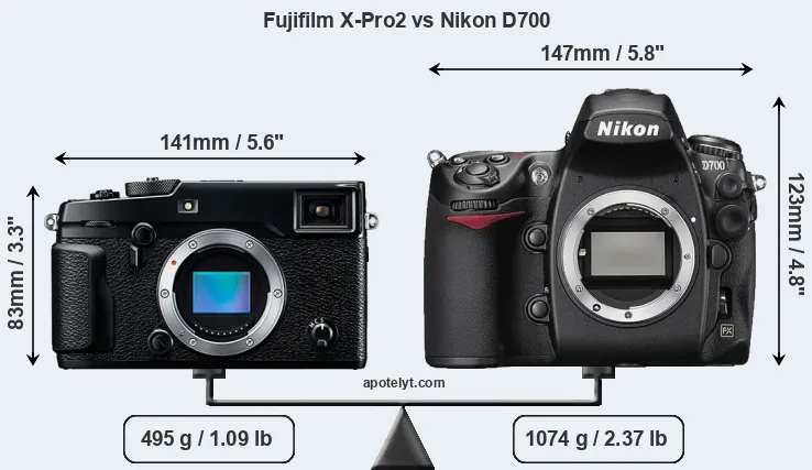 The side-by-side display below illustrates the physical size and weight of the Fujifilm X-Pro2 and the Nikon D700. The two cameras are presented according to their relative size. Three successive views from the front, the top, and the rear are shown. All width, height and depth dimensions are rounded to the nearest millimeter.