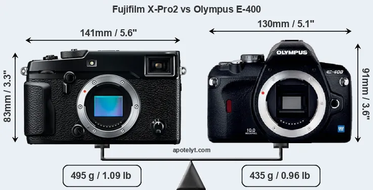 The side-by-side display below illustrates the physical size and weight of the Fujifilm X-Pro2 and the Olympus E-400. The two cameras are presented according to their relative size. Three consecutive perspectives from the front, the top, and the back are available. All size dimensions are rounded to the nearest millimeter.