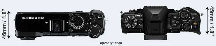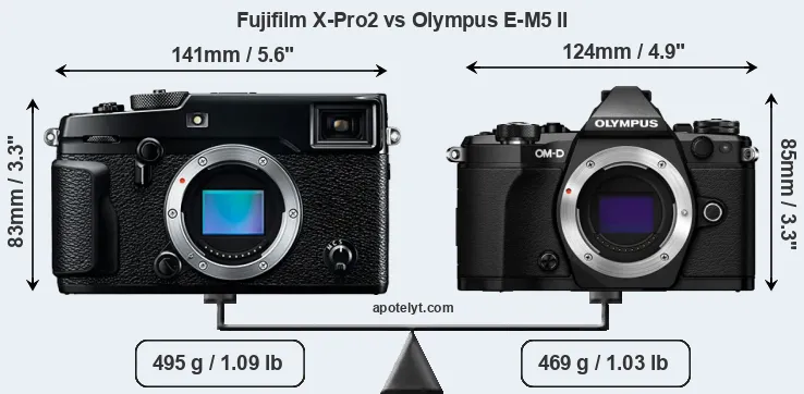 An illustration of the physical size and weight of the Fujifilm X-Pro2 and the Olympus E-M5 II is provided in the side-by-side display below. The two cameras are presented according to their relative size. Three successive views from the front, the top, and the rear are shown. All width, height and depth dimensions are rounded to the nearest millimeter.