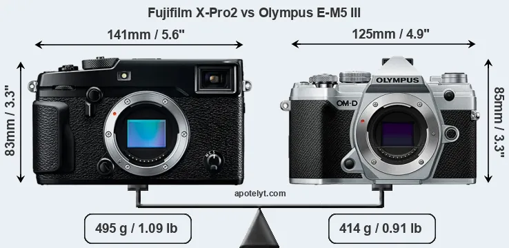 The side-by-side display below illustrates the physical size and weight of the Fujifilm X-Pro2 and the Olympus E-M5 III. The two cameras are presented according to their relative size. Three consecutive views from the front, the top, and the rear side are shown. All width, height and depth measures are rounded to the nearest millimeter.