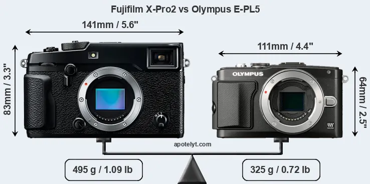 If the front view area (width x height) of the cameras is taken as an aggregate measure of their size, the Olympus E-PL5 is considerably smaller (39 percent) than the Fujifilm X-Pro2. Moreover, the E-PL5 is markedly lighter (34 percent) than the X-Pro2. It is worth mentioning in this context that the X-Pro2 is splash and dust resistant, while the E-PL5 does not feature any corresponding weather-sealing.