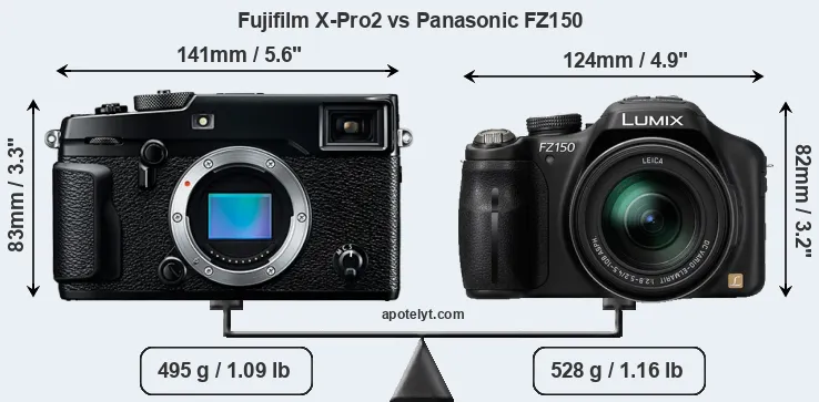 If the front view area (width x height) of the cameras is taken as an aggregate measure of their size, the Panasonic FZ150 is notably smaller (13 percent) than the Fujifilm X-Pro2. It is worth mentioning in this context that the X-Pro2 is splash and dust resistant, while the FZ150 does not feature any corresponding weather-sealing.