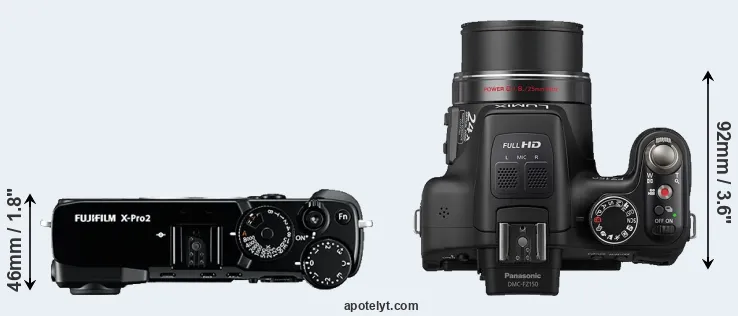The side-by-side display below illustrates the physical size and weight of the Fujifilm X-Pro2 and the Panasonic FZ150. The two cameras are presented according to their relative size. Three consecutive views from the front, the top, and the rear side are shown. All width, height and depth dimensions are rounded to the nearest millimeter.