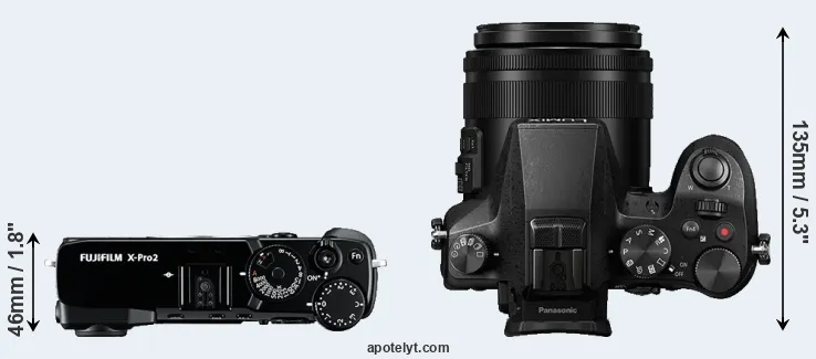 If the front view area (width x height) of the cameras is taken as an aggregate measure of their size, the Panasonic FZ2000 is notably larger (20 percent) than the Fujifilm X-Pro2. It is worth mentioning in this context that the X-Pro2 is splash and dust resistant, while the FZ2000 does not feature any corresponding weather-sealing.