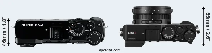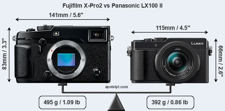 If the front view area (width x height) of the cameras is taken as an aggregate measure of their size, the Panasonic LX100 II is considerably smaller (35 percent) than the Fujifilm X-Pro2. It is worth mentioning in this context that the X-Pro2 is splash and dust resistant, while the LX100 II does not feature any corresponding weather-sealing.