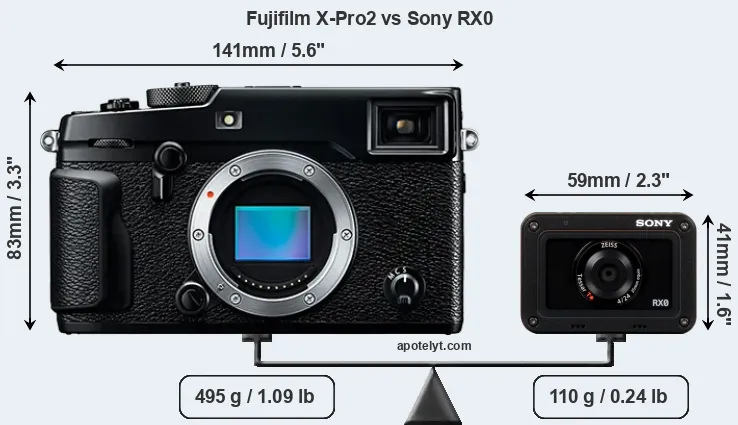 If the front view area (width x height) of the cameras is taken as an aggregate measure of their size, the Sony RX0 is considerably smaller (79 percent) than the Fujifilm X-Pro2. In this context, it is worth noting that both cameras are splash and dust-proof and can, hence, be used in inclement weather conditions or harsh environments. More than that, the RX0 is water-proof up to 10m and can, thus, be used for underwater photography.