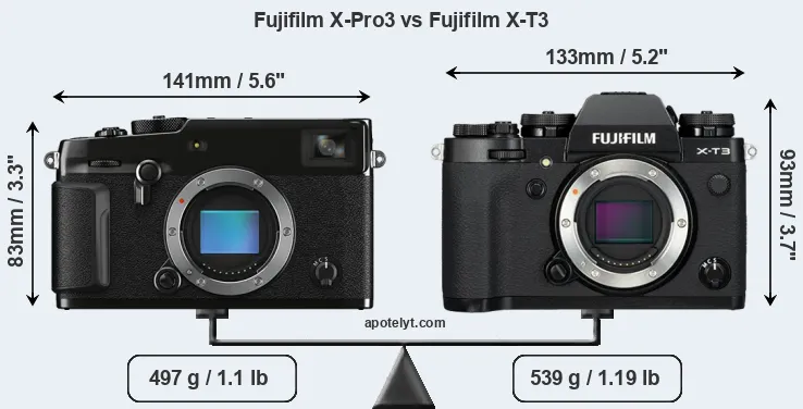 An illustration of the physical size and weight of the Fujifilm X-Pro3 and the Fujifilm X-T3 is provided in the side-by-side display below. The two cameras are presented according to their relative size. Three consecutive perspectives from the front, the top, and the back are available. All size dimensions are rounded to the nearest millimeter.