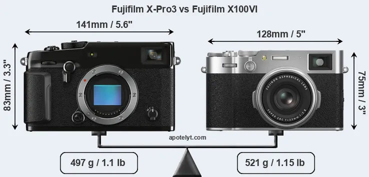An illustration of the physical size and weight of the Fujifilm X-Pro3 and the Fujifilm X100VI is provided in the side-by-side display below. The two cameras are presented according to their relative size. Three consecutive perspectives from the front, the top, and the back are available. All size dimensions are rounded to the nearest millimeter.