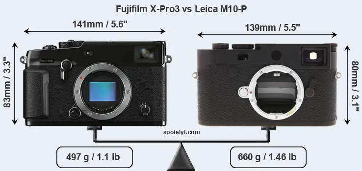 An illustration of the physical size and weight of the Fujifilm X-Pro3 and the Leica M10-P is provided in the side-by-side display below. The two cameras are presented according to their relative size. Three consecutive perspectives from the front, the top, and the back are available. All width, height and depth measures are rounded to the nearest millimeter.