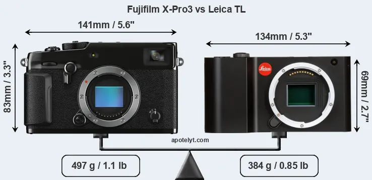 If the front view area (width x height) of the cameras is taken as an aggregate measure of their size, the Leica TL is notably smaller (21 percent) than the Fujifilm X-Pro3. Moreover, the TL is markedly lighter (23 percent) than the X-Pro3. It is worth mentioning in this context that the X-Pro3 is splash and dust resistant, while the TL does not feature any corresponding weather-sealing.