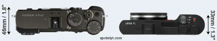 The side-by-side display below illustrates the physical size and weight of the Fujifilm X-Pro3 and the Leica TL. The two cameras are presented according to their relative size. Three consecutive views from the front, the top, and the rear side are shown. All size dimensions are rounded to the nearest millimeter.
