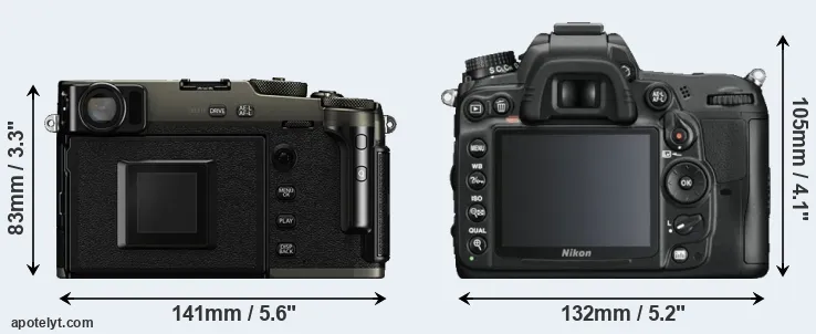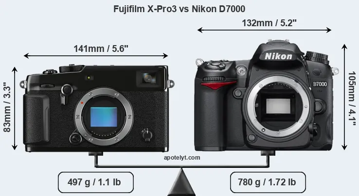 An illustration of the physical size and weight of the Fujifilm X-Pro3 and the Nikon D7000 is provided in the side-by-side display below. The two cameras are presented according to their relative size. Three consecutive perspectives from the front, the top, and the back are available. All size dimensions are rounded to the nearest millimeter.