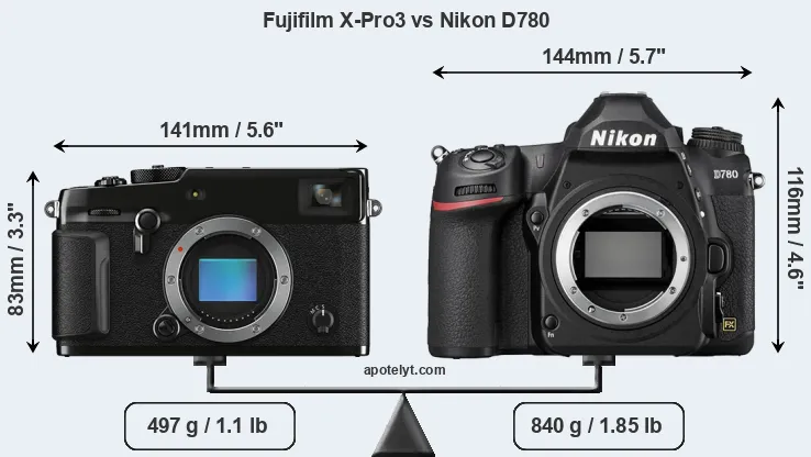 An illustration of the physical size and weight of the Fujifilm X-Pro3 and the Nikon D780 is provided in the side-by-side display below. The two cameras are presented according to their relative size. Three consecutive views from the front, the top, and the rear side are shown. All size dimensions are rounded to the nearest millimeter.