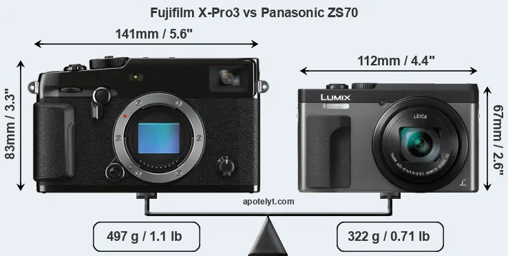 An illustration of the physical size and weight of the Fujifilm X-Pro3 and the Panasonic ZS70 is provided in the side-by-side display below. The two cameras are presented according to their relative size. Three consecutive perspectives from the front, the top, and the back are available. All size dimensions are rounded to the nearest millimeter.