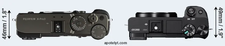 The physical size and weight of the Fujifilm X-Pro3 and the Sony A6300 are illustrated in the side-by-side display below. The two cameras are presented according to their relative size. Three consecutive views from the front, the top, and the rear side are shown. All width, height and depth measures are rounded to the nearest millimeter.
