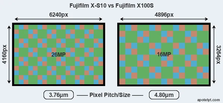 Despite having a slightly smaller sensor, the Fujifilm X-S10 offers a higher resolution of 26 megapixels, compared with 16 MP of the Fujifilm X100S. This megapixels advantage comes at the cost of a higher pixel density and a smaller size of the individual pixel (with a pixel pitch of 3.76μm versus 4.80μm for the X100S). However, it should be noted that the X-S10 is much more recent (by 7 years and 9 months) than the X100S, and its sensor will have benefitted from technological advances during this time that make it possible to gather light more efficiently. Coming back to sensor resolution, it should be mentioned that neither of the two cameras has an anti-alias filter installed, so they are able to capture all the detail the sensor resolves.