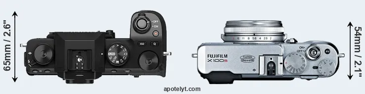 If the front view area (width x height) of the cameras is taken as an aggregate measure of their size, the Fujifilm X100S is notably smaller (12 percent) than the Fujifilm X-S10. In this context, it is worth noting that neither the X-S10 nor the X100S are weather-sealed.