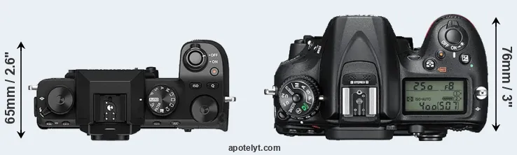 The physical size and weight of the Fujifilm X-S10 and the Nikon D7200 are illustrated in the side-by-side display below. The two cameras are presented according to their relative size. Three consecutive views from the front, the top, and the rear side are shown. All width, height and depth dimensions are rounded to the nearest millimeter.