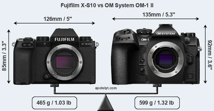 If the front view area (width x height) of the cameras is taken as an aggregate measure of their size, the OM System OM-1 II is notably larger (16 percent) than the Fujifilm X-S10. Moreover, the OM-1 II is markedly heavier (29 percent) than the X-S10. It is noteworthy in this context that the OM-1 II is splash and dust-proof, while the X-S10 does not feature any corresponding weather-sealing.