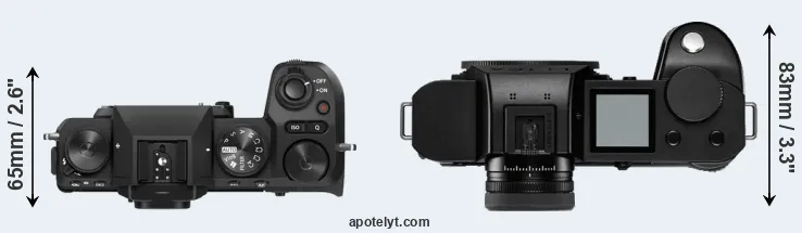 The physical size and weight of the Fujifilm X-S20 and the Leica SL2-S are illustrated in the side-by-side display below. The two cameras are presented according to their relative size. Three consecutive views from the front, the top, and the rear side are shown. All size dimensions are rounded to the nearest millimeter.