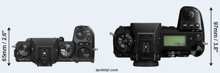 The physical size and weight of the Fujifilm X-S20 and the Panasonic S1 are illustrated in the side-by-side display below. The two cameras are presented according to their relative size. Three consecutive views from the front, the top, and the rear side are shown. All size dimensions are rounded to the nearest millimeter.